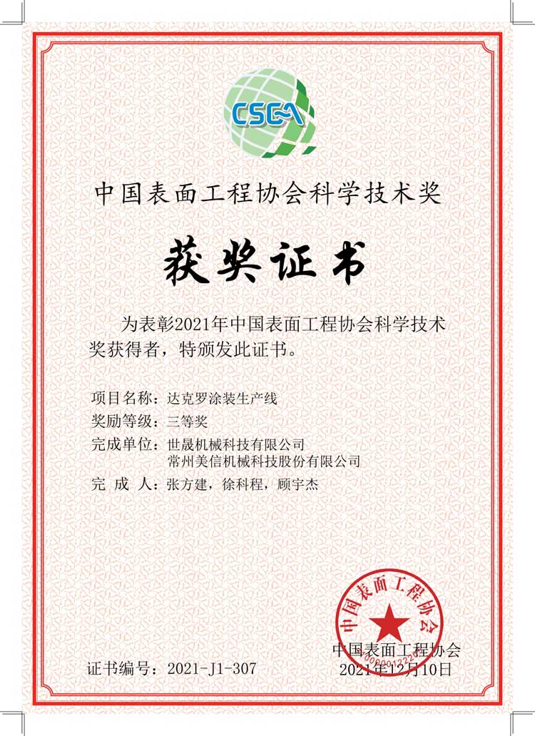 熱烈祝賀世晟集團子公司(達克羅涂裝生產線項目)喜獲2021年度“中國表面工程協會科學技術獎”三等獎